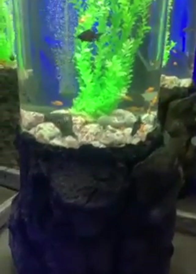 tall, cylindrical fish tank. Inside, several small orange fish swim around. A larger black fish with a long tail is also visible. A bright green plastic plant stands in the center, surrounded by white and reddish-brown rocks. A small, black, grated object sits among the rocks. The tank is lit with a blue light from above. The tank sits on a dark, rough-textured base that resembles artificial rock. The floor around the tank is light gray. A person wearing a dark suit is partially visible in the background.