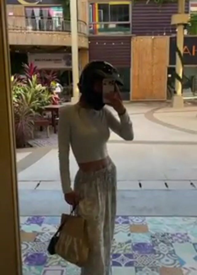A woman in a motorcycle helmet takes a selfie in a mirror. The woman wears a long-sleeved crop top and patterned pants. She holds a brown tote bag. The mirror is situated in a public outdoor space featuring shops and restaurants. The floor is tiled with geometric patterns. Plants and outdoor seating are visible in the background.