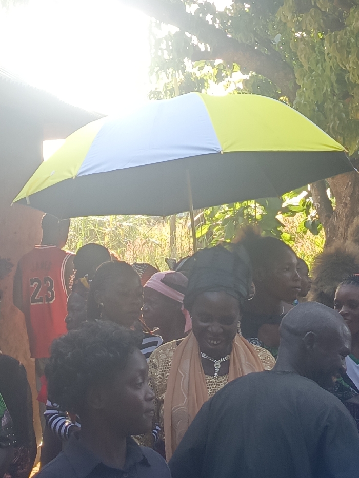 This image depicts a gathering of approximately a dozen individuals outdoors in Akwanga, Nigeria. A large, partially open umbrella with alternating light blue/white and yellow-green panels provides overhead shade in the upper center. Strong sunlight is evident from the upper left, creating lens flare and bright highlights on foliage in the background. The crowd consists of adults of African descent, standing in close proximity. A man in the far left background wears a red jersey with "23" and "JAMES" visible on the back. In the mid-ground, a woman with a dark headwrap and a light gold, possibly lace, top is prominent, smiling directly at the viewer. She wears a prominent silver-colored necklace with a large pendant. To her left, another woman with short, dark curly hair, wearing a dark polo-style shirt, faces right. A man in a dark shirt, with his back mostly to the viewer, is positioned in the immediate foreground on the right. Other individuals, some wearing headwraps, are partially visible throughout the densely packed group. The background features lush green foliage and tree trunks, indicating a natural environment. A dark, possibly earthen or brick, building structure is partially visible on the far left.