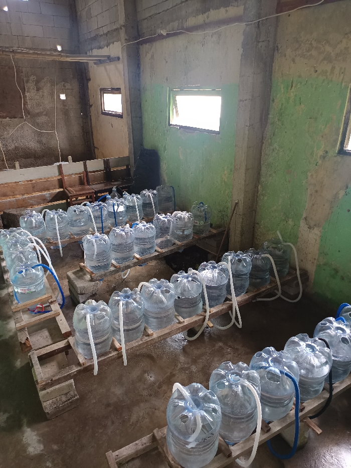 This image captures an indoor facility located in Gunung Putri, Indonesia, functioning as a liquid processing or cultivation area. The primary subjects are approximately 40-50 clear plastic water bottles, appearing to be of 19-liter capacity, filled with a transparent liquid. These bottles are systematically arranged on multiple tiers of unrefined wooden racks, constructed from wooden planks and supported by concrete blocks and smaller wooden pieces. Most bottles are interconnected via translucent white and blue plastic tubing inserted into their openings, suggesting a fluid transfer or circulation system. The floor is concrete, exhibiting damp spots and scattered white residue beneath the racks. The surrounding walls are composed of concrete blocks; the right wall is partially covered with peeling green paint over a lighter base, featuring two rectangular windows that admit natural light. The far left wall is bare concrete block, with one smaller window and a series of unpainted wooden benches or platforms, along with two wooden chairs. Exposed electrical wiring is visible along the walls. A black bag and a wooden stick lean against the wall on the right side. No individuals are present in the scene, and no direct actions are depicted beyond the static arrangement of the liquid-filled containers and their interconnections. The environment suggests an functional but unpolished industrial or storage setting.