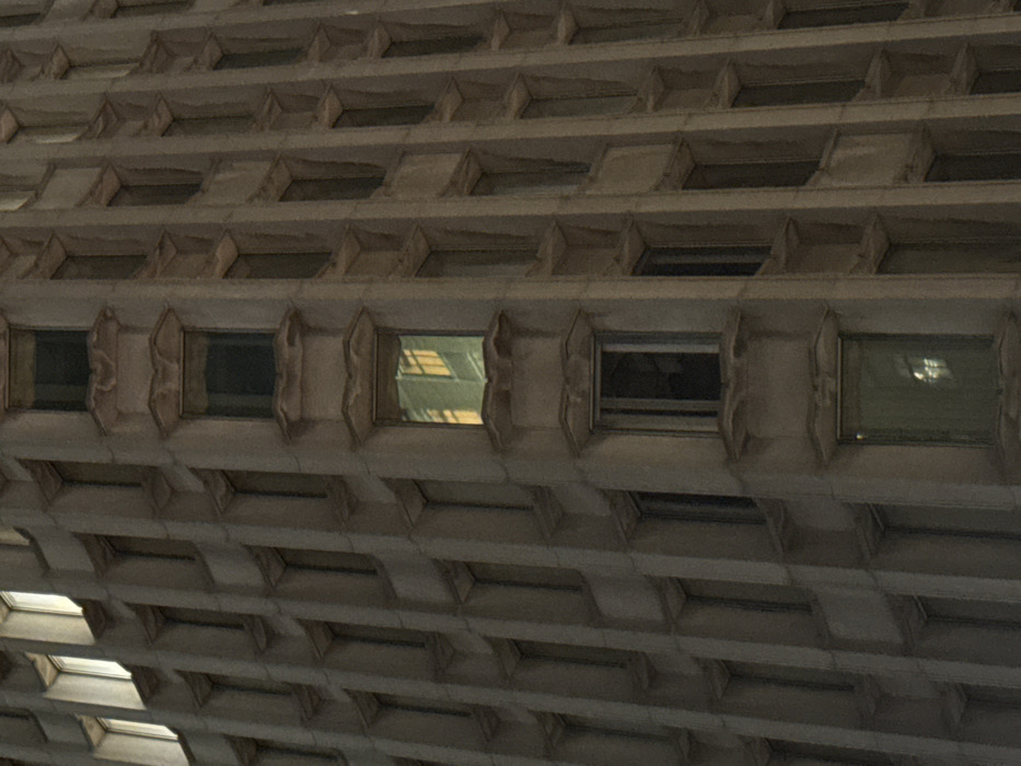 The image displays a close-up, low-light view of the Saltonstall Building, located at 100 Cambridge Street in Boston, Massachusetts, United States. The multi-story structure, appearing to be constructed of light-colored concrete or stone, presents a facade characterized by strong vertical lines formed by projecting piers and numerous deeply recessed rectangular windows. The building's prominent chamfered corner is visible, featuring a stack of distinctively framed windows, each encased by decorative, stepped sills and lintels. Most window panes are dark, indicative of nighttime or low interior light, but several windows on the upper left side and one corner window on a mid-level floor are illuminated from within, emitting a warm, yellowish-orange light. No people, discernible objects within the rooms, or specific actions are visible; the focus is exclusively on the architectural details of the building's exterior.