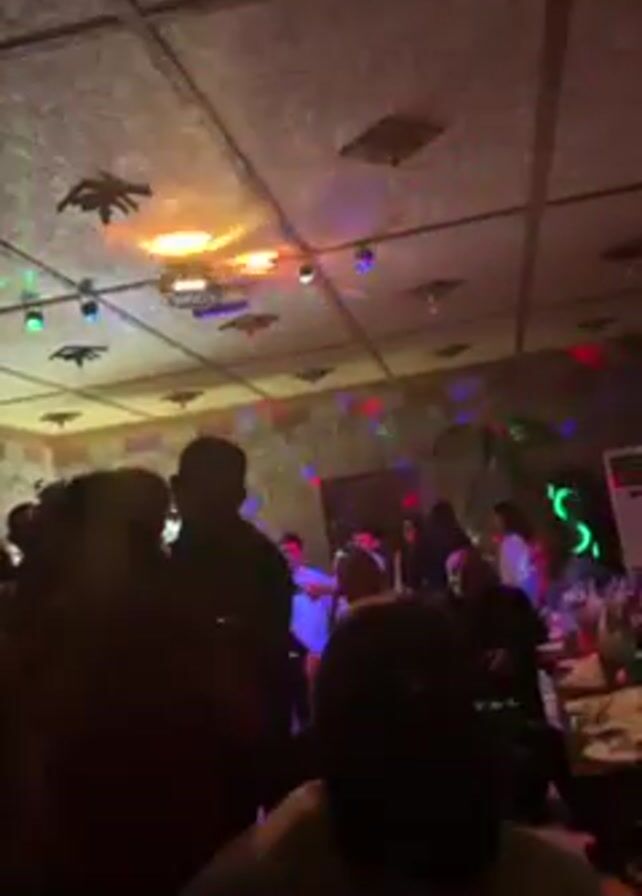 A video shot in a dimly lit room with colored party lights shows a gathering of people, mostly in silhouette