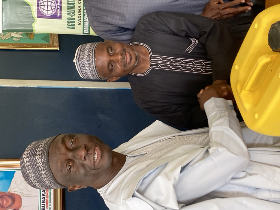 An indoor scene in Unguwar Rimi, Kaduna, Nigeria, depicts two men shaking hands. The man on the left, with dark skin, wears a light grey traditional Nigerian tunic featuring intricate embroidery and a grey patterned cap; he smiles towards the viewer. The man on the right, also with dark skin and a smiling expression, wears a black traditional Nigerian tunic with white embroidery and a patterned grey cap. A third individual, wearing a grey garment, is partially visible on the far right. In the foreground, a yellow plastic jerrycan with a black cap rests on a surface. The background consists of a dark blue wall. A partially visible framed portrait on the left identifies "ABUBAKA" as "COMMISSIONER / MINSTRY OF ENVIRONMENT". On the right, a banner displays the World Bank logo and text indicating "AGRO-CLIMATE" and "KADUNA STATE".