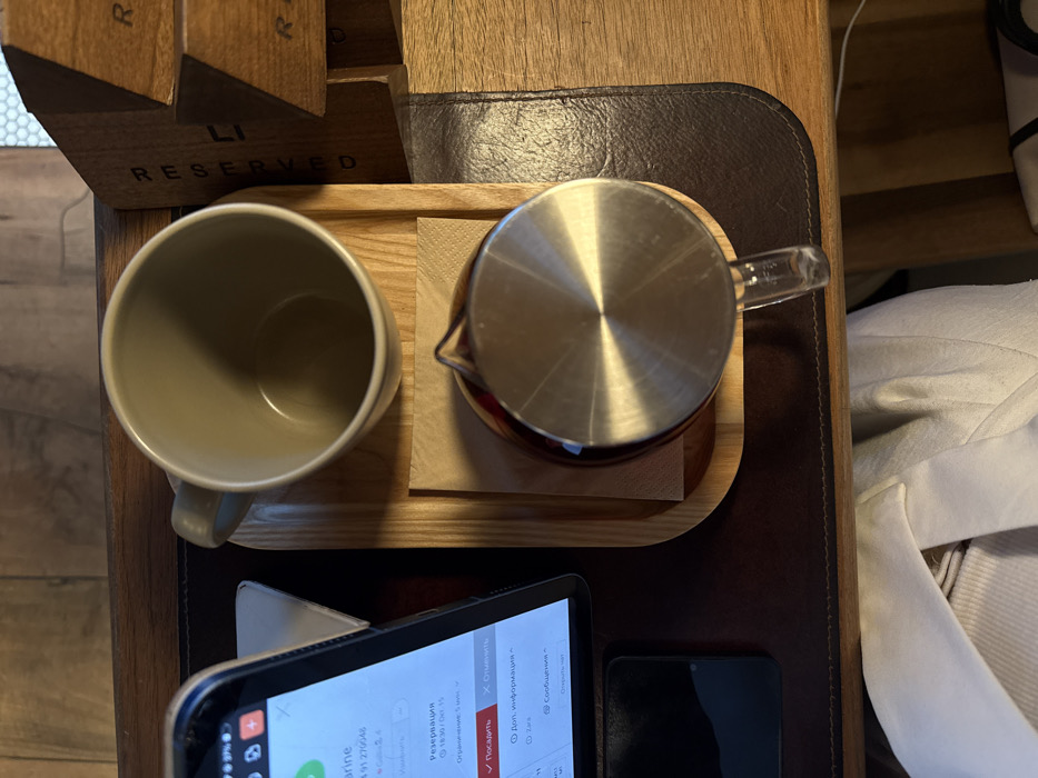 An overhead view reveals a portion of a cafe or restaurant table in Yerevan, Armenia. The scene features a dark brown surface, possibly a leather placemat, underlying a light wooden serving tray. On the tray, an empty, light-colored ceramic mug is positioned above a glass pitcher with a circular brushed metal lid, containing a dark liquid and resting on a light brown paper napkin. To the left of the tray, a tablet device displays a reservation interface with text identifying "Yerevan, Armenia," a reservation for "Catherine," and options such as "Посадить" (Seat) and "Отменить" (Cancel). A smaller dark rectangular object is visible beneath the tablet. To the right, a wooden "RESERVED" sign stands vertically. The lower portion of the image shows a white garment, indicating the presence of a person seated at the table.