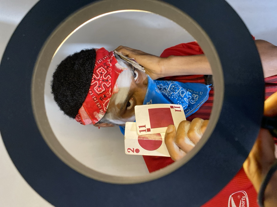 A person is centrally framed through a dark, circular object, likely a ring light, in an indoor setting with a plain light-colored wall background, located in Ngleshi Amanfro, Ghana. The individual has dark skin, short black curly hair, and wears a red bandana with white paisley patterns around their forehead. A blue bandana with white patterns covers the lower half of their face, acting as a mask. White markings are visible on the bridge of their nose and above their eyes. Their eyes are directly focused on the viewer. The individual is wearing a red top, with a partial white logo visible on the left side. In their left hand, they hold two non-standard playing cards vertically; the left card displays a red circle and the number "2," while the right card displays a red square and the number "11." In their right hand, a stack of paper currency is held against the side of their head near the ear. The hands holding the circular framing device are partially visible at the bottom of the image.