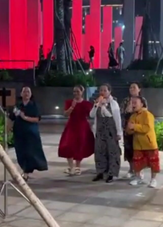 A group of seven women is gathered outdoors at night, seemingly singing or performing. One woman holds a microphone and appears to be leading the group, while the others stand around her, clapping and smiling. They are dressed in various outfits, including dresses, pants, and jackets, with one woman in a bright yellow jacket and printed skirt standing slightly to the side. The area is paved and lit by streetlights, with decorative metal poles lining the edges of the scene. In the background, there are tall, red-lit structures that add to the ambiance. People can be seen walking on the raised platform behind the group.
