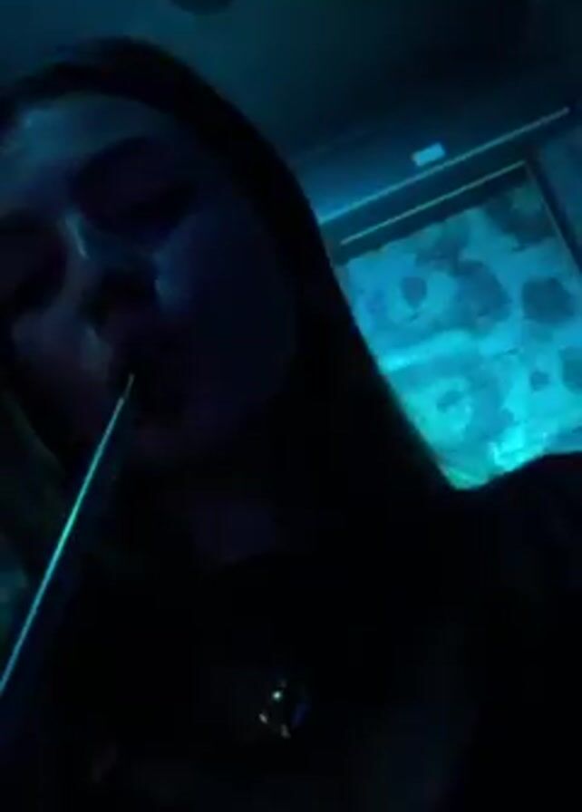 A young woman is smoking from a hookah in a dark room with pulsating colored lights. She has long dark hair and is wearing a dark shirt with a necklace. The room is dimly lit with changing colors of green, blue, and purple. There is music playing in the background. The video ends abruptly.