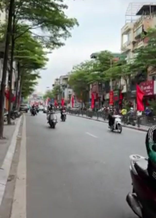 city street in Vietnam, with a steady flow of motorcycle traffic. The street is lined with buildings, mostly two or three stories high, and trees on both sides. Many red flags are hanging along the street, possibly for a celebration or festival. The sky is overcast. People are riding motorcycles in both directions, most wearing masks. A white car also drives down the street.