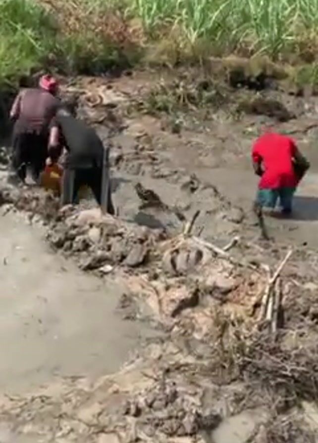 Three individuals are working in a muddy, watery area