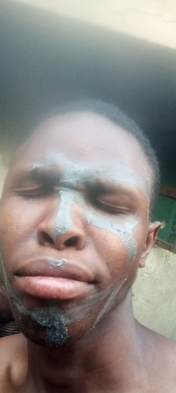 A close-up portrait of an individual with dark skin is captured in Sabon Tasha, Nigeria. The subject's eyes are closed, and a greyish, pasty substance is applied to their face in specific patterns: a vertical line extending from the forehead down the bridge of the nose, horizontal lines across the forehead above each eye, lines extending horizontally from the outer corners of the eyes, and a concentrated patch on the chin. The substance appears textured and partially dried. The subject's full lips are visible, and a small amount of dark facial hair is present on the chin, partly covered by the applied substance. The upper chest and shoulders are visible, indicating bare skin. In the background, to the subject's right, a section of light green wooden material with faint white markings, possibly "0-0051," and a small dark rectangular object are discernible. Below this, a light-colored surface, possibly concrete or ground, is visible. The lighting is ambient, and the image has a slight softness.
