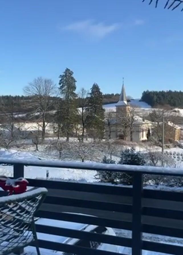 view from a balcony on a sunny, winter day. A metal railing and a wicker chair are visible in the foreground, both covered in snow. In the distance, a snow-covered landscape includes a church with a steeple, several trees, and a forest-covered hill. The sky is clear and blue.