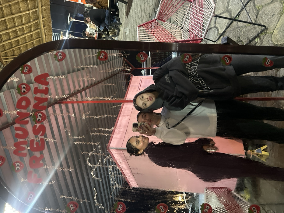 Three people are reflected in a mirror. The mirror has red strawberry decorations and pink lettering that reads "Mundo Fresonia". The person closest to the mirror wears a dark-colored dress, while the second person wears a white sweater and holds a phone, presumably taking the picture. The third person wears a dark hoodie. Behind them, there are outdoor tables, chairs, and thatched roofing.