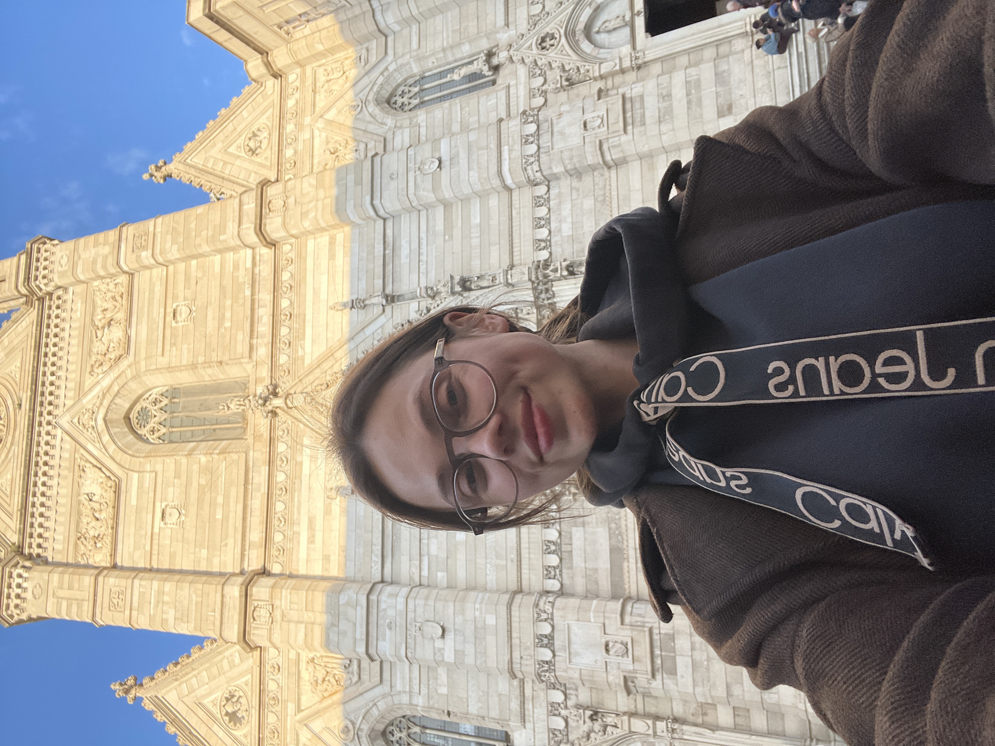 A young woman with glasses is taking a selfie in front of the Naples Cathedral (Duomo di Napoli), Italy