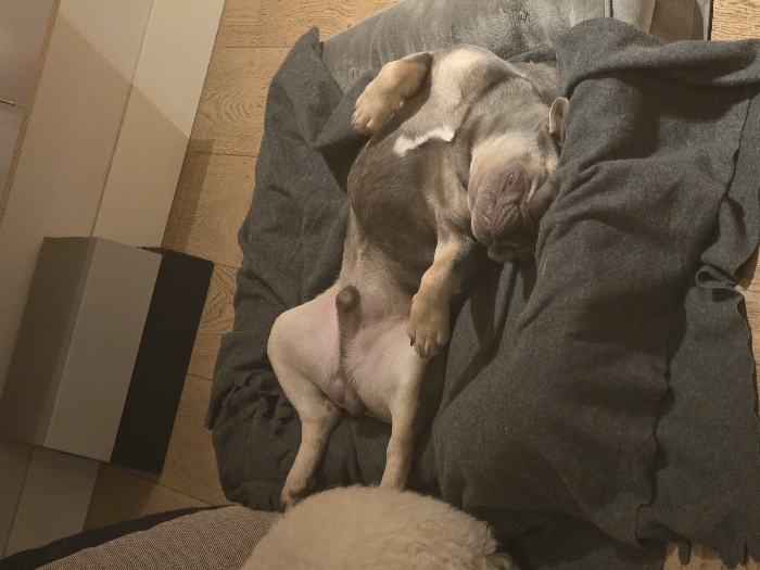 A light brown and white bulldog lies upside down on a gray sweatshirt. The dog's belly is exposed, and its head is resting on the sweatshirt. The dog appears to be sleeping or very relaxed. A small, fluffy white object is visible in the lower part of the image, possibly another animal. A beige wall and dark furniture appear to the left of the dog.
