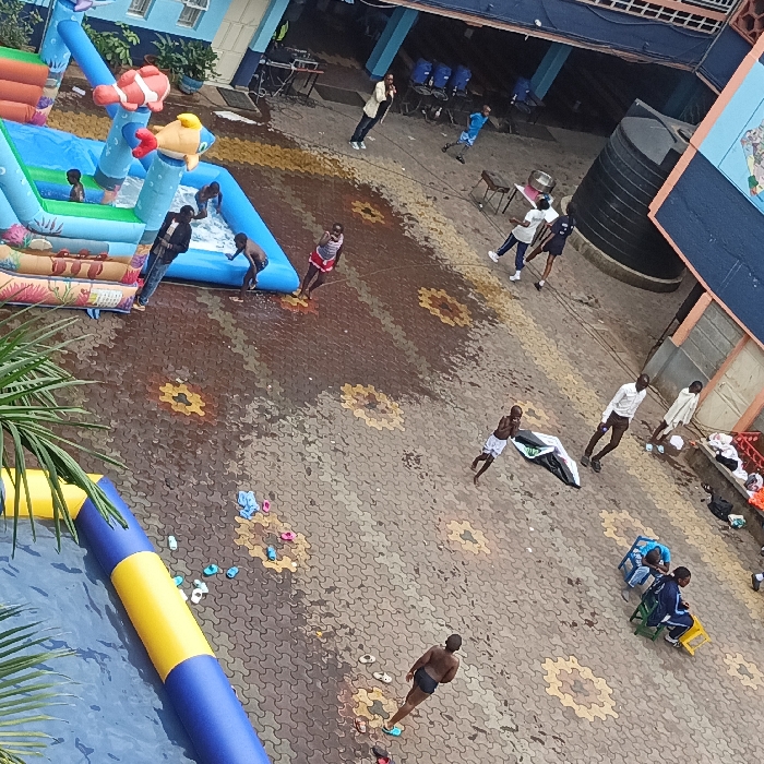 The image depicts an outdoor recreational area in Nairobi, Kenya, characterized by a patterned paved courtyard. The ground, composed of interlocking brown and grey pavers with interspersed decorative yellow floral patterns, shows wet patches and scattered footwear, including various sandals and flip-flops. On the left, a large, multi-level blue inflatable water park structure is featured, complete with slides, a shallow pool, and orange and yellow cartoon fish decorations. Several children are actively engaged in play within this inflatable pool. Approximately 15-20 individuals are present across the scene. Near the inflatable structure, two males stand on the wet paving; one is dressed in jeans and a dark top, the other in black swimwear. In the mid-ground, a male in white shorts holds a crumpled black and white object. Other individuals are seen walking or standing, including a person running in the upper background and two males walking towards the right in the mid-ground. In the background, blue and light blue buildings with white trim are visible, alongside a large black cylindrical water storage tank. In the bottom right corner, several children are seated on small plastic chairs of various colors, including blue, green, and yellow. A large blue and yellow inflatable tube lies partially in water in the bottom-left foreground.