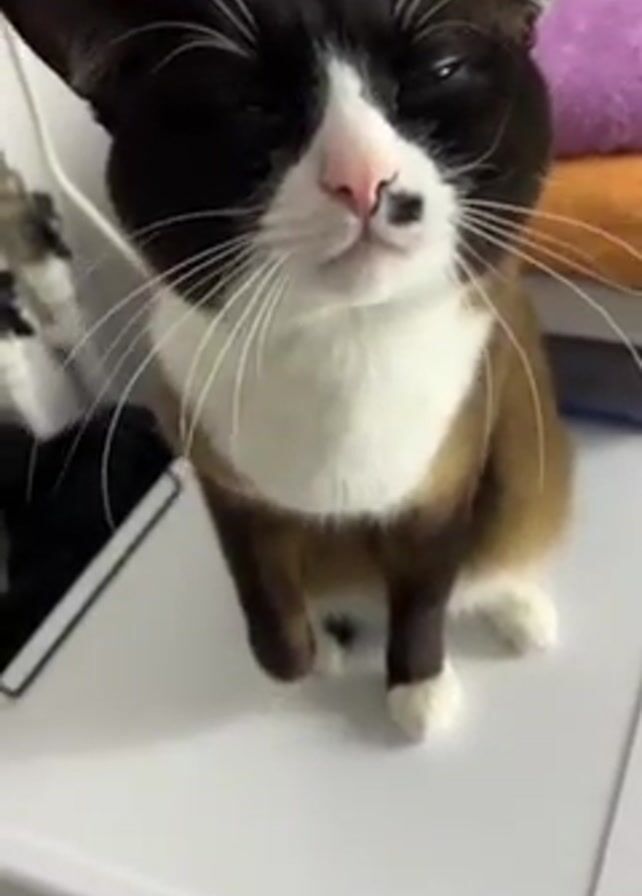 A video depicts a short-haired cat seated on top of a white, possibly plastic, surface, likely a washing machine or storage unit
