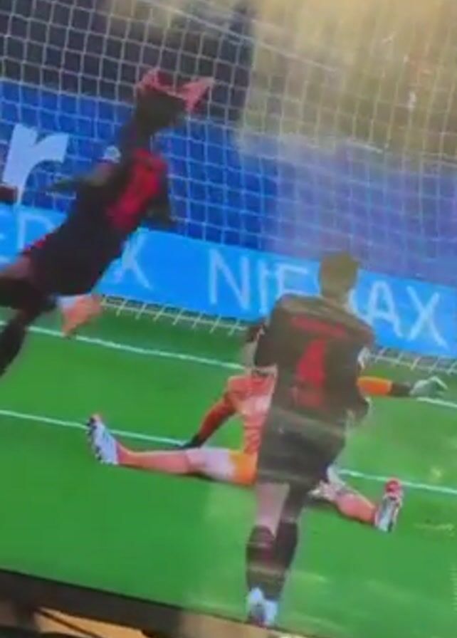 A television screen shows a soccer game being played. The score is tied 1-1. In the first frame, a player wearing black with the number 4 on his back jumps in the air near the goalie, who is wearing orange and sprawled out on the ground. A player wearing black with the number 8 on his back stands to the left of the goalie. All are in front of the goal. In the second frame, the view is from inside the goal, looking out onto the field. The goalie in orange is standing further out in the field.