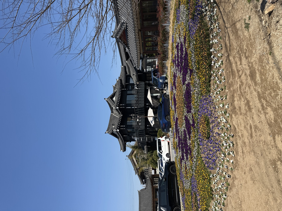 The image presents an outdoor scene in Gyeongju-si, South Korea, under a clear, cloudless blue sky. In the immediate foreground, a broad expanse of light brown soil transitions into a large, rectangular flowerbed displaying pansies in distinct patterns of white, purple, yellow, and orange blooms. Beyond the flowerbed, a paved area serves as a parking space, occupied by several vehicles: a black SUV on the left, a white minivan, a dark blue sedan (likely a Tesla Model 3), and a blue minivan on the right. In the midground and background, a complex of traditional Korean-style buildings is prominent. The central and largest structure is a multi-story building characterized by its black exterior walls, dark gray tiled roofs with ornate curved eaves, and multiple windows. Outdoor seating with white umbrellas is visible near its base, suggesting a commercial establishment like a cafe or restaurant. To the right of this building, another traditional Korean structure with a dark tiled roof and reddish-brown walls is visible. Additional traditional buildings with similar rooflines are partially visible further left and behind the main structures. Several indistinct human figures are present near the buildings and parked vehicles. On the far right, bare tree branches extend into the frame, indicating the season.