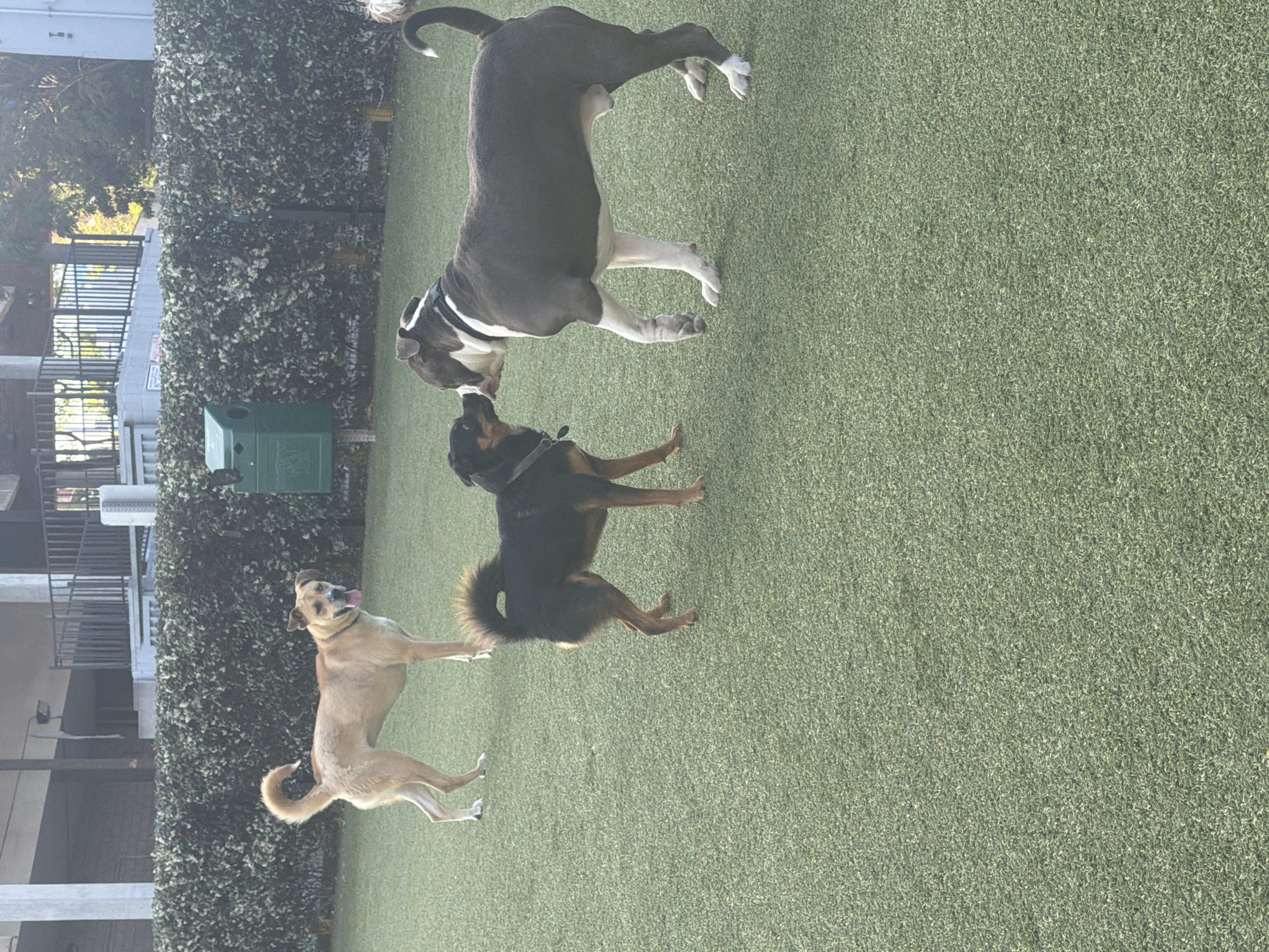 three dogs playing on a green artificial turf surface. One is a large grey and white dog standing on its hind legs, appearing to interact with a black and brown dog. A third, tan-colored dog is also present, appearing to play separately. The scene is located at a dog park at the intersection of 8371 Melrose Avenue, West Hollywood, California, United States of America. A green trash can is visible in the background near a wall covered with dense greenery. A building is present on the left side of the frame.
