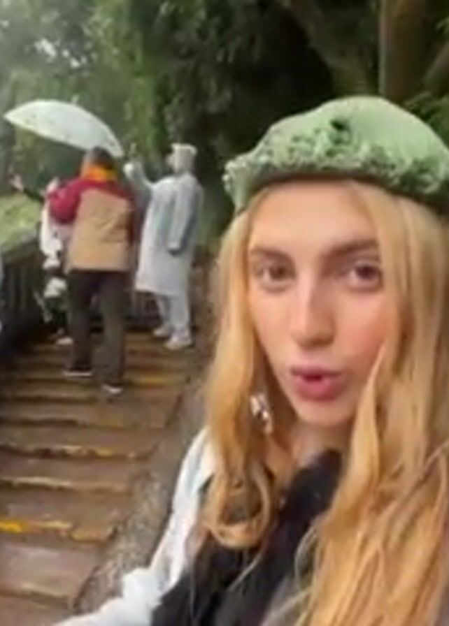 A young woman with long blonde hair and a green crocheted beret is speaking to the camera in a rainy outdoor setting. She is wearing a grey poncho and a black scarf. Behind her, a group of people are walking up a set of wooden stairs. Many of them are wearing ponchos or holding umbrellas. The background is filled with lush greenery, suggesting a forest or jungle environment. The ground is wet, indicating recent or ongoing rain. The overall atmosphere seems damp and somewhat crowded due to the presence of the other tourists.