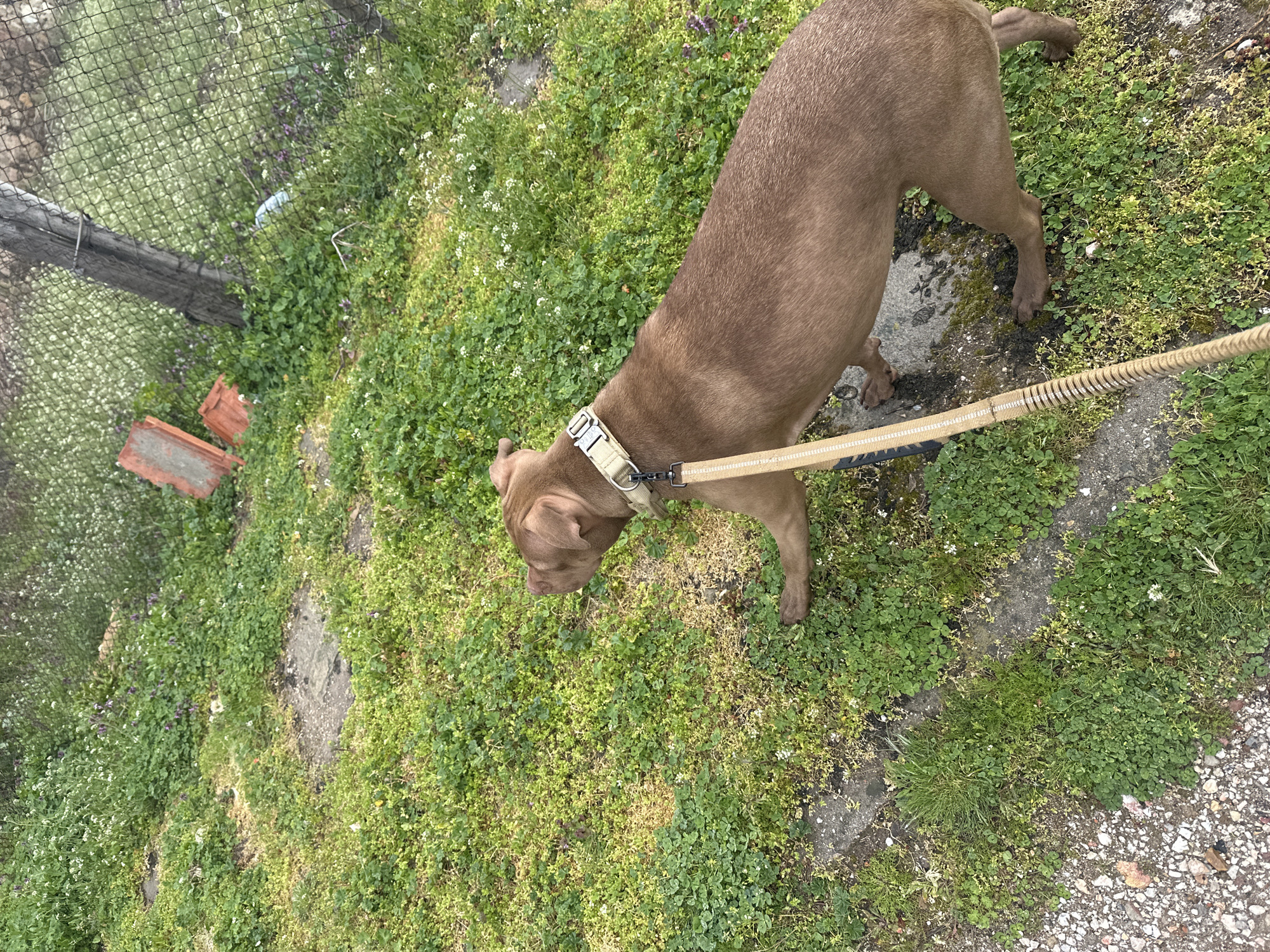 In Malevo, Bulgaria, a brown, short-haired dog with a tan collar and leash is observed from an elevated perspective, positioned on uneven ground
