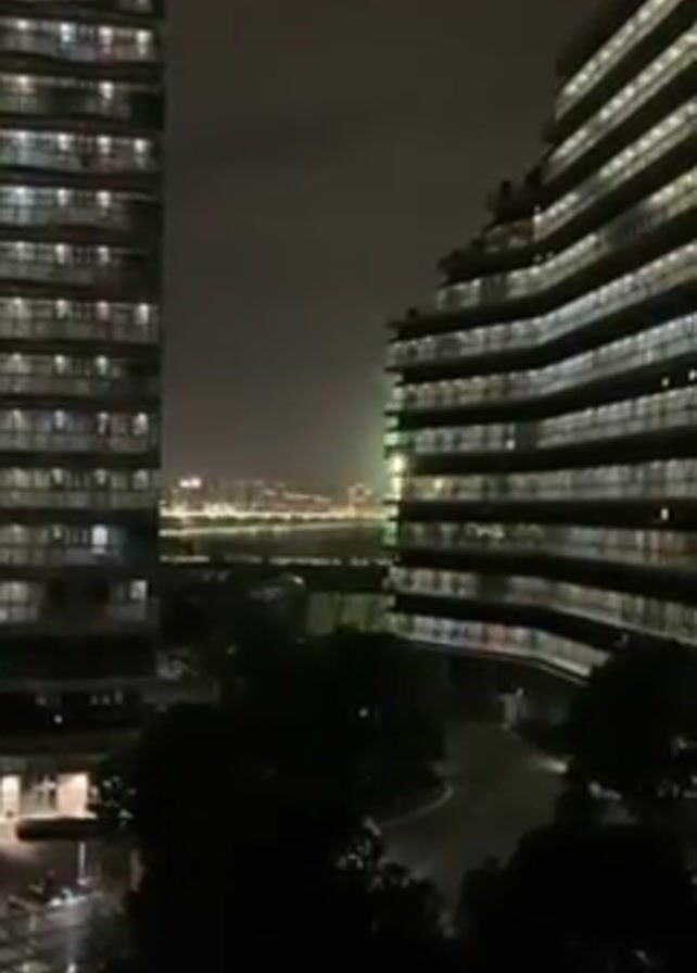 nighttime view from a high vantage point, possibly a balcony or window, overlooking a city skyline. Two modern, tall buildings with numerous lit windows flank the view, creating a narrow corridor towards the cityscape in the distance. The sky is dark and overcast. Below, there are trees and what appears to be a road or path, also dark due to the night. The overall impression is of an urban scene at night. A baby coos in the background.