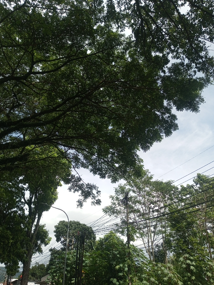 Lush green trees dominate the frame, their foliage densely obscuring the sky. A mix of tall trees, shrubs, and foliage lines the roadside. Utility poles and a street lamp stand among the greenery, with power lines crisscrossing the sky. In the far distance, rooftops of houses and a glimpse of hills can be seen, hinting at a settled area amidst the natural landscape. The overcast sky suggests a diffused light.