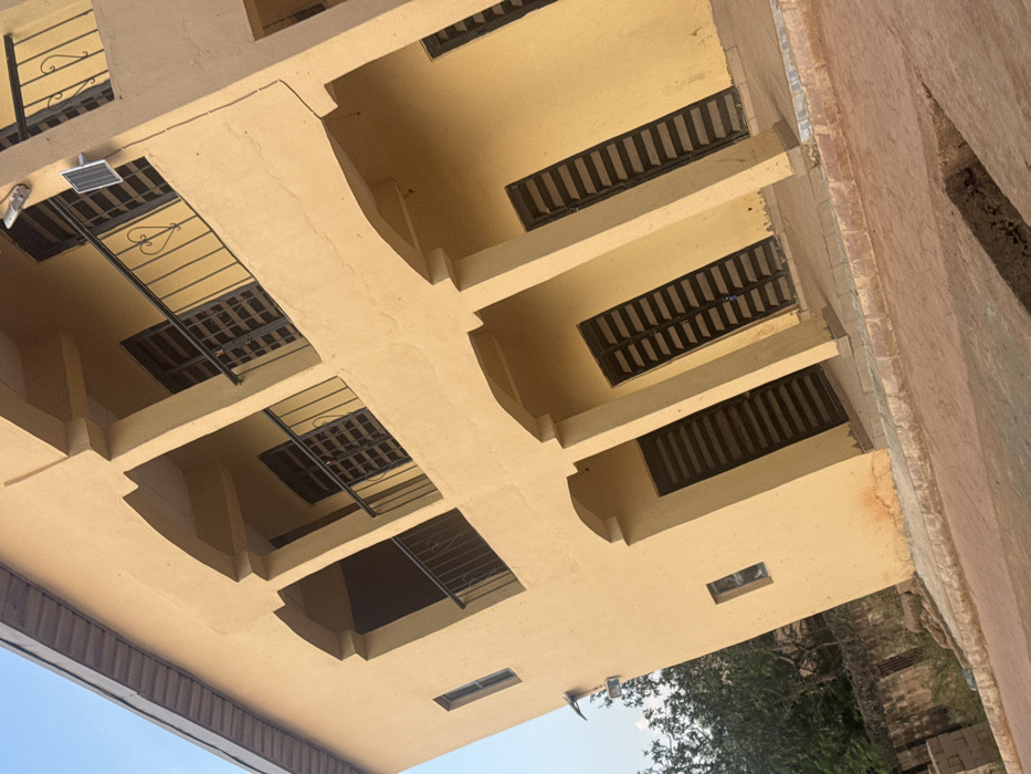 This image displays a three-story building with a light ochre or sandy yellow facade, located in Ekwulobia, Nigeria