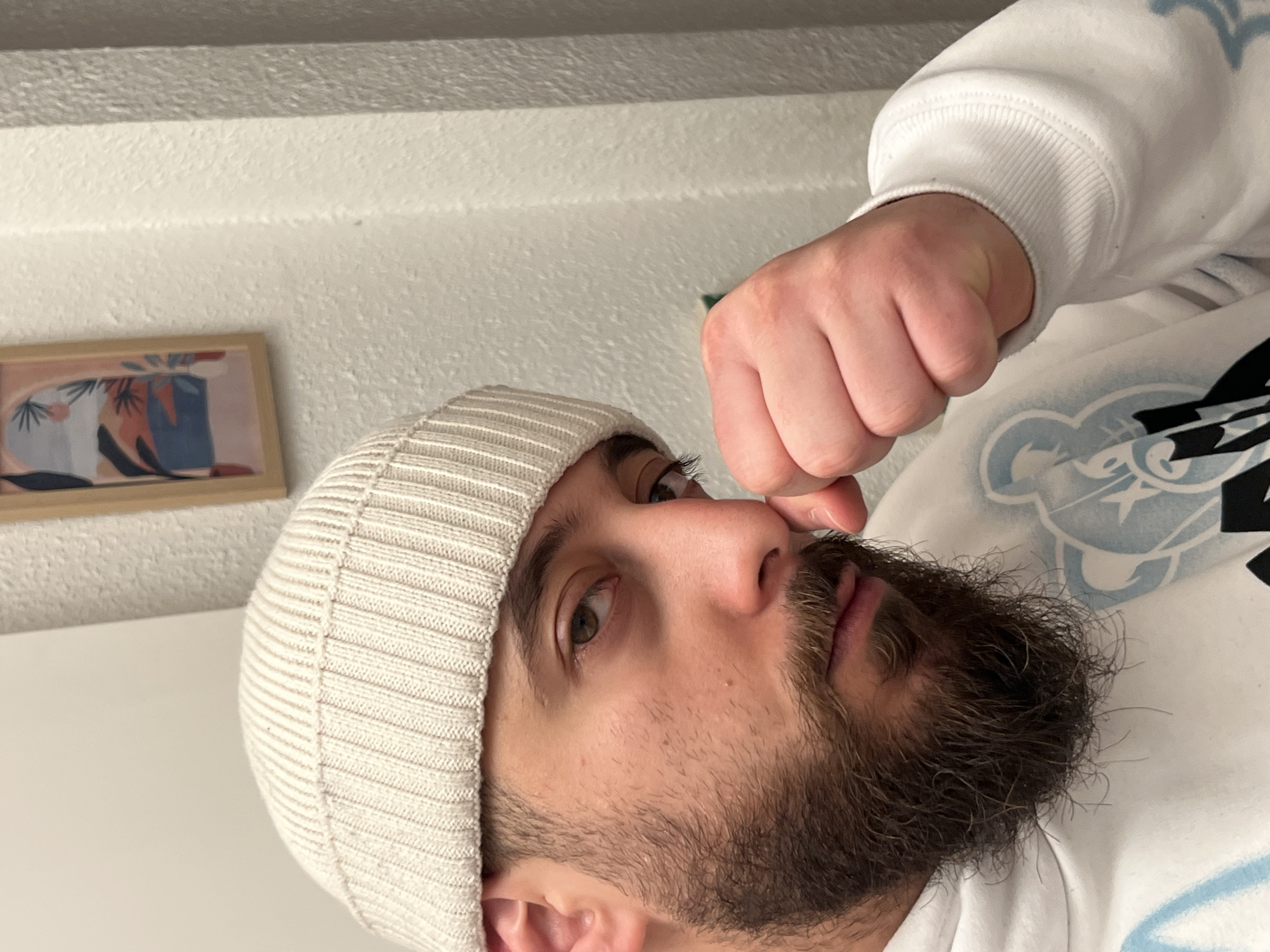 A close-up shot features a person wearing a white ribbed beanie and a white sweatshirt. The person has a dark beard and is making a fist near their face. In the background, a framed picture hangs on a white wall. The location in Strasbourg, France, cannot be determined from the visual information available.