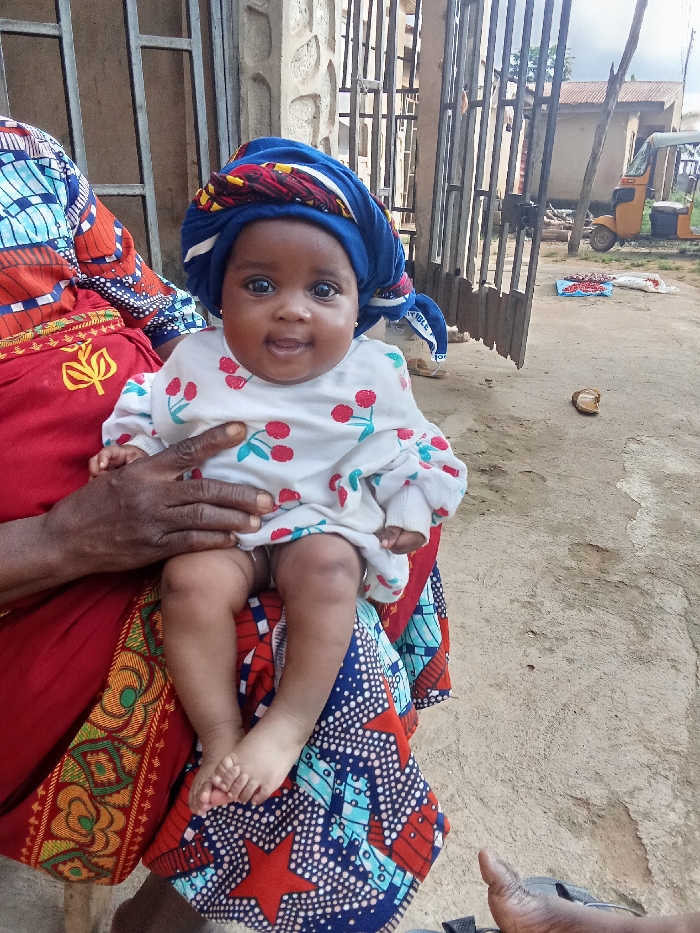 An adult, visible from the torso down, holds an infant outdoors in Akwanga, Nigeria. The adult's dark-skinned hands support the infant, who is seated on the adult's lap, covered by a red, blue, and white patterned fabric. The adult wears a red wrapper with orange and yellow embroidery. The infant, with dark skin, dark eyes, and a smiling expression, faces forward. They wear a white long-sleeved dress patterned with red cherries and a blue headwrap featuring additional colorful fabric and partial text. Small, gold-colored earrings are visible on the infant. The immediate background to the left features a grey, textured wall with a decorative pattern. To the right, a partially open metal gate with vertical bars is present. Beyond the gate, an unpaved outdoor area with a mix of concrete and dirt ground extends into the mid-distance. A light-colored building with a corrugated metal roof stands further back, behind which a yellow three-wheeled auto-rickshaw is parked. On the ground, a blue tarpaulin displays red items, possibly peppers, laid out to dry, with a white cloth next to it. A broken coconut shell rests on the ground to the right. A foot wearing a black sandal is visible in the bottom right corner of the frame. The sky is overcast.