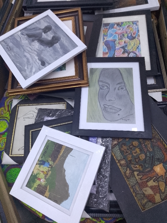 The image displays a cluttered arrangement of various framed artworks within an interior setting in Ikate, Nigeria