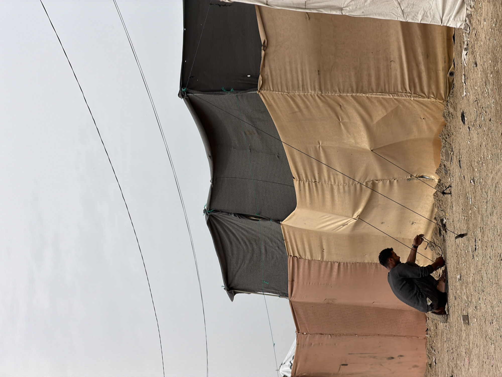 - "The image, taken in Gaza, shows a man kneeling and working on the ropes securing a makeshift tent or structure" by FM-PSI0J3, licensed under CC BY 4.0