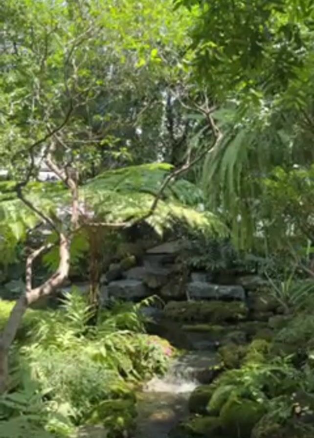 The camera is static, capturing a lush, green outdoor scene with a small stream running through it. The stream is bordered by an array of ferns and moss-covered rocks, with a backdrop of tiered stone forming small waterfalls. A variety of trees and plants fill the frame, their leaves creating a dense canopy overhead, dappling the scene with sunlight. The overall atmosphere is tranquil and natural, evoking a sense of serene wilderness.