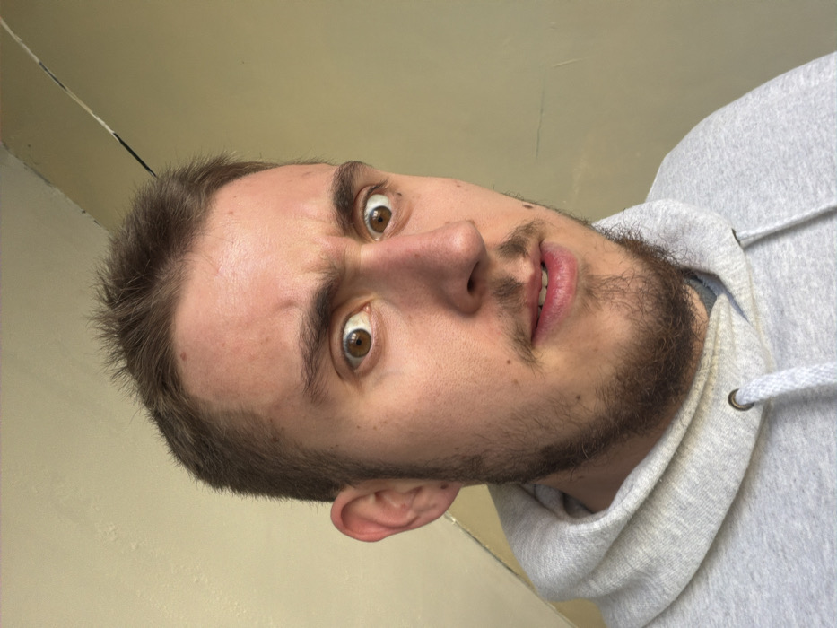 The image displays a close-up portrait of an adult male situated indoors, with the location identified as Radomir, Bulgaria. The subject is Caucasian, featuring short brown hair, a short, dark beard, and stubble. He is dressed in a light grey hooded sweatshirt with white drawstrings visible at the neckline. His facial expression includes wide-open brown eyes with dilated pupils and visible sclera, furrowed eyebrows, and a slightly open mouth, indicating an intense or surprised demeanor. The individual is looking directly forward. The background consists of a plain, uniformly light-colored wall, appearing beige or light yellow. A faint, dark diagonal line or crease is present in the upper right quadrant of the background, suggesting a wall junction or imperfection.