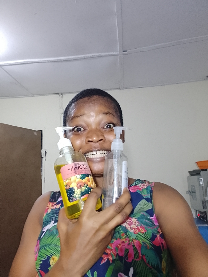 A woman with short hair holds two pump bottles of hand soap, one clear and empty, and the other filled with yellow soap with a fruit label