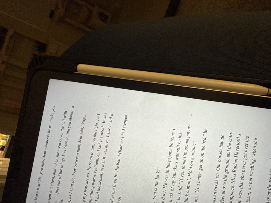 An electronic tablet, enclosed in a dark-colored case, is depicted at an angle, displaying illuminated text against a white background. A light-colored stylus is magnetically attached to the tablet's right edge. The tablet rests or is held on a dark, textured surface, possibly fabric. The visible text describes a narrative, including character names such as "Jem" and "Miss Rachel Haverford." The background is dark, out of focus, and indistinct, indicative of an indoor setting with low ambient lighting. No individuals are visible. The specific location within Laredo, United States, is not discernible from the image.
