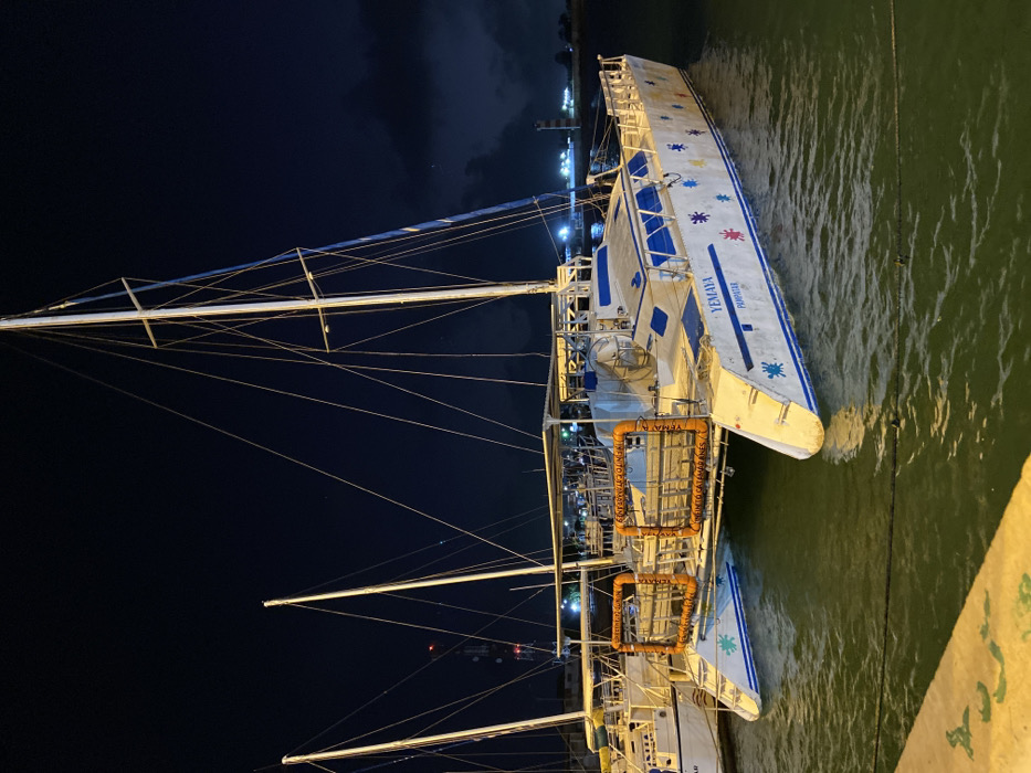 A nighttime scene depicts a marina in Punta de Piedras, Venezuela. The primary subject is a large white catamaran, prominently displaying the names "YEMAYA" and "PAMPATAR" on its starboard hull. The catamaran's hull is decorated with various multicolored, splash-like patterns in blue, purple, green, yellow, and pink. It features a tall mast with extensive rigging, a central cabin with blue-trimmed windows, and an overhead canopy covering much of its deck. Two orange, rectangular flotation devices or life rafts, each marked with black text "CENTRO AVENTURA YEMAYA" and "PUERTO CATAMARANES," are secured on the vessel's stern deck. To the left, part of another white sailing vessel with a mast is visible, docked alongside. The foreground consists of a concrete dock or pier edge, stained with faint green markings. The water in the marina is a dark greenish-blue, reflecting ambient artificial lights. In the background, numerous artificial lights illuminate distant structures along the shoreline. A red and white striped tower, consistent with a lighthouse, stands out on the horizon to the right. The sky above is dark, showing some indistinct cloud formations. No individuals are visible in the image, and the vessels appear stationary.