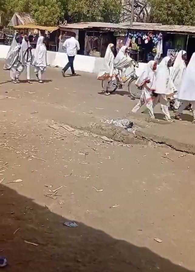 The video depicts a group of people dressed in white robes walking along a dirt road in an outdoor environment. Some of the people are wearing white shoes and have orange accents on their robes. At least one person is riding a bicycle while wearing the white robes. There are shops and buildings in the background, along with trees. The road appears to be under construction, with visible cracks and patches of dirt. In the foreground, there is a red motorcycle parked. Several other people, dressed in casual clothing, are observing the group in white. One man is seen wearing a teal-colored traditional African shirt. A couple of men are seen working on motorcycles. The overall scene appears to be a bustling, everyday street scene with the addition of a group dressed in unique attire.