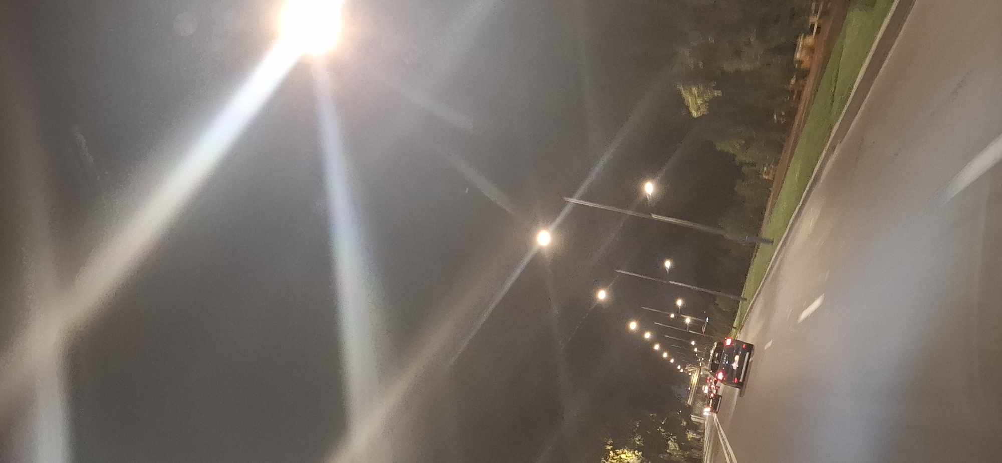 The image depicts a nighttime view of a multi-lane asphalt road in the city of Rabat, Morocco, likely captured from a moving vehicle. The scene is illuminated by numerous artificial light sources. The road features visible white dashed lane markings. Several vehicles are observed traveling in the same direction, with their taillights illuminated. The closest identifiable vehicle is a dark-colored hatchback or small SUV. Along the right side of the road, a continuous line of approximately ten or more tall, dark-colored streetlamp poles extends into the distance, each topped with a circular, amber-white light source. A narrow, well-maintained grassy median strip separates the road from dense dark green foliage and trees on the right side. Similar dense foliage borders the left side of the road. The dark night sky in the upper portion of the image is characterized by prominent, diagonal lens flares, suggesting strong light sources either directly entering the camera lens or reflecting intensely within it. No pedestrians or specific structures are clearly discernible beyond the foliage.