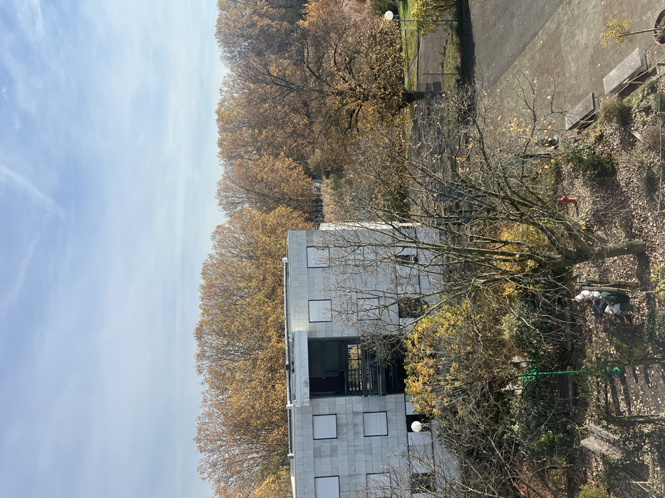 This image depicts an outdoor scene in Schiltigheim, France, captured during daylight under a partly cloudy blue sky with wispy white clouds and a faint contrail in the upper right. The scene is characterized by autumn foliage. In the midground, a multi-story building with a light grey, squared-panel exterior is visible. Multiple windows on the building are covered by white roller shutters. An open recess in the building's center reveals dark-colored balconies or walkways on at least two levels. A small, white satellite dish is mounted below a window on the lower left section of the building's facade. Behind the building, and extending across the horizon, is a dense line of deciduous trees displaying predominantly golden-orange autumn leaves. To the right of the building, a paved area or road with a white spherical light fixture on a pole is visible. The foreground is dominated by a scattering of bare-branched trees and smaller bushes with yellowing leaves, indicative of the season. The ground is largely covered with fallen brown and yellow leaves. In the lower left quadrant, partially obscured by foliage, a single individual is seated on a bench or low structure. They wear light-colored headwear and appear to be engaged with an object in their lap or on the ground; a dark green bag is near them. No specific actions or interactions are discernible. A wooden park bench is also present on the left. Toward the center-right foreground, a red fire hydrant stands on the leaf-covered ground. To the right, a paved brick walkway features two modern, light-colored concrete or stone benches, with a small potted tree adjacent to the lower bench. No other individuals or animals are present.