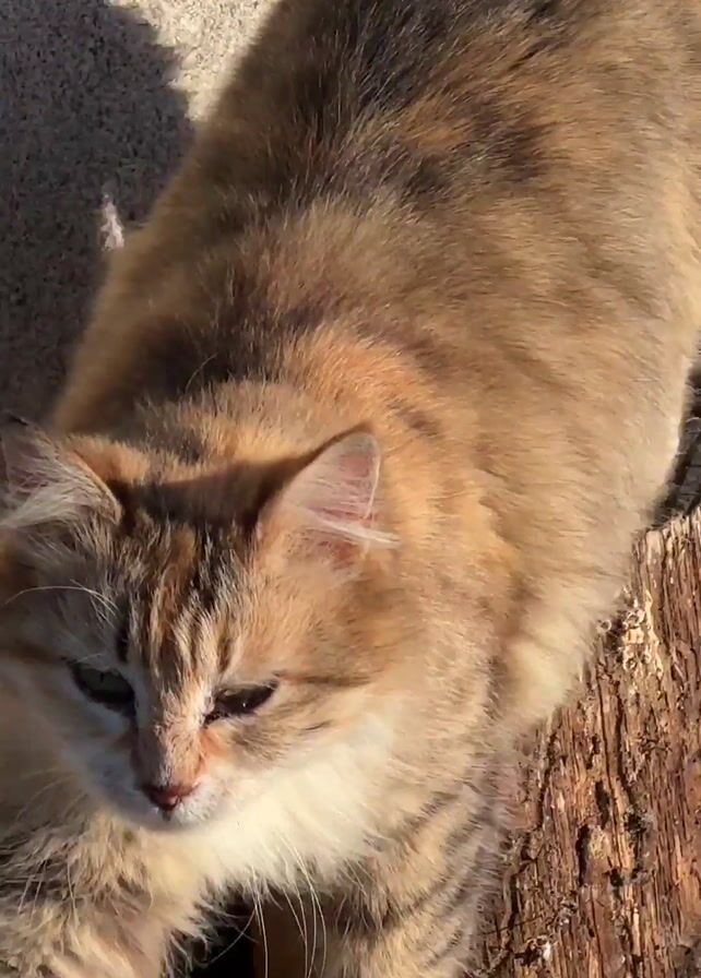 medium-haired cat. It is predominantly brownish-gold with tabby markings on its legs and tail. The cat is sitting on a piece of wood near a concrete wall, then it stands up and walks slowly along a paved area, with its tail held high. The environment includes gray concrete surfaces, some greenery growing between the paving stones, and a wooden stump visible in the background. The lighting is bright, suggesting it is daytime.