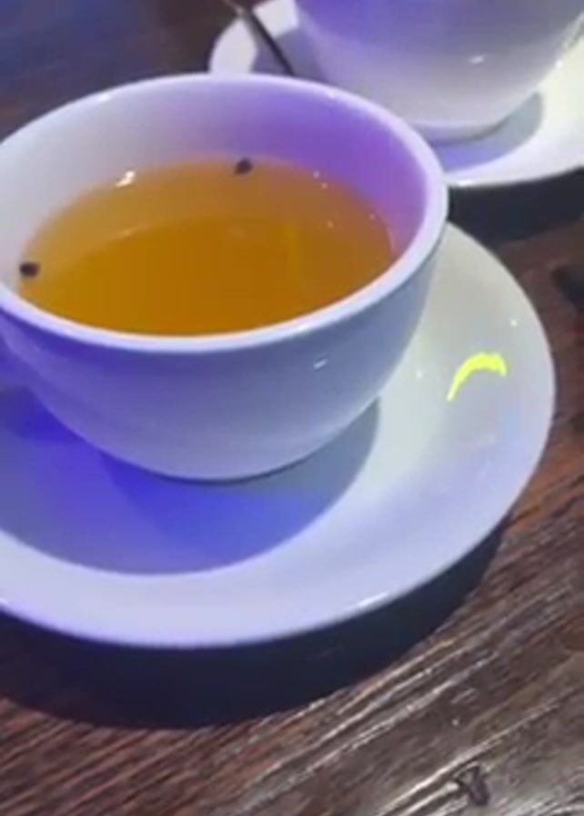 two cups of tea on a wooden table, with a teapot set down next to them. One of the tea cups has a few small, dark objects floating in it. The camera then shows a woman sitting at the table. She has short dark hair and is wearing a dark red sweatshirt. The scene appears to be indoors, likely in a cafe or restaurant, with a dark blue ambiance.