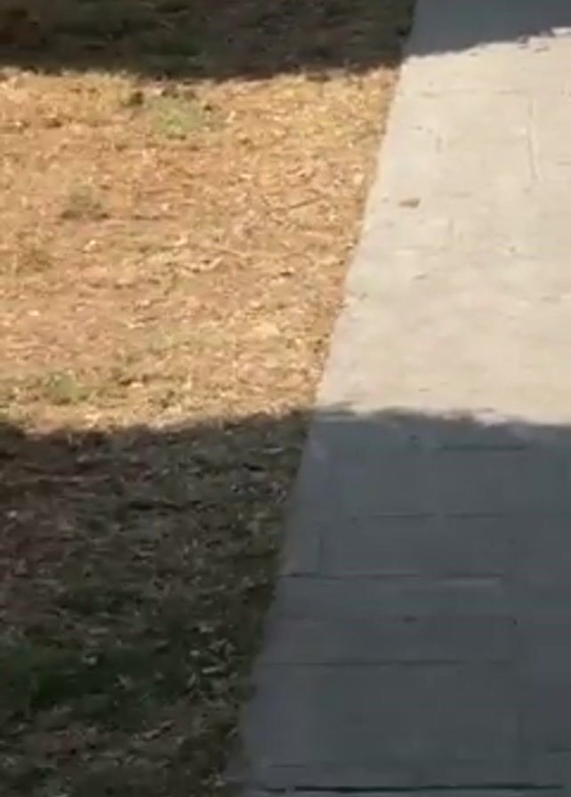 A black dog is running along a sidewalk. The sidewalk is paved with gray concrete blocks. There is a green hedge on the right side of the sidewalk. A grassy area with some trees is on the left. A sign with Spanish writing is in the background.