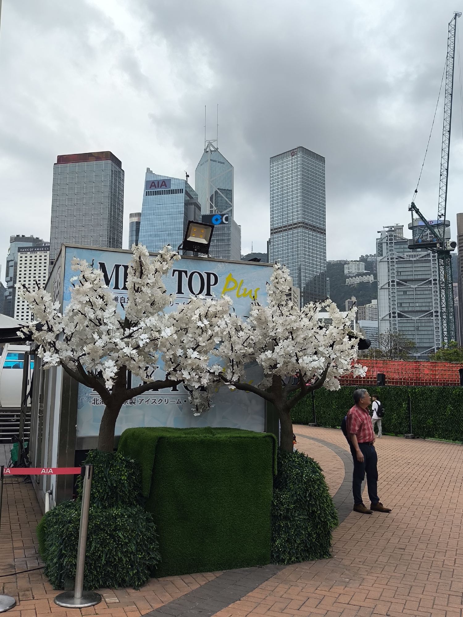 The image depicts an outdoor urban scene in Hong Kong, China, under an overcast sky. Prominent skyscrapers, including the Bank of China Tower, AIA Tower, and HSBC Main Building, are visible in the background, identifying the Central district. In the midground, two artificial cherry blossom trees, bearing white flowers, stand in front of a light blue promotional booth or container. The booth displays "TOP Plus" in large English characters and Japanese text below, with an LED floodlight affixed to its top. A large rectangular object covered in artificial green grass is positioned to the right of the left tree, complemented by smaller artificial foliage bushes at the base of the trees. The ground is paved with reddish-brown interlocking bricks. A male individual, appearing East Asian with grey hair, wearing a red and white plaid short-sleeved shirt, dark trousers, and brown shoes, stands in the midground. He has a dark backpack and is facing right, looking upwards. Another person in a white shirt is visible further back to the right. A large green construction crane is present on the far right, towering over buildings. A dark green artificial hedge fence and a red barrier define the boundary behind the foreground elements, with a forested hillside and additional buildings in the distant background.