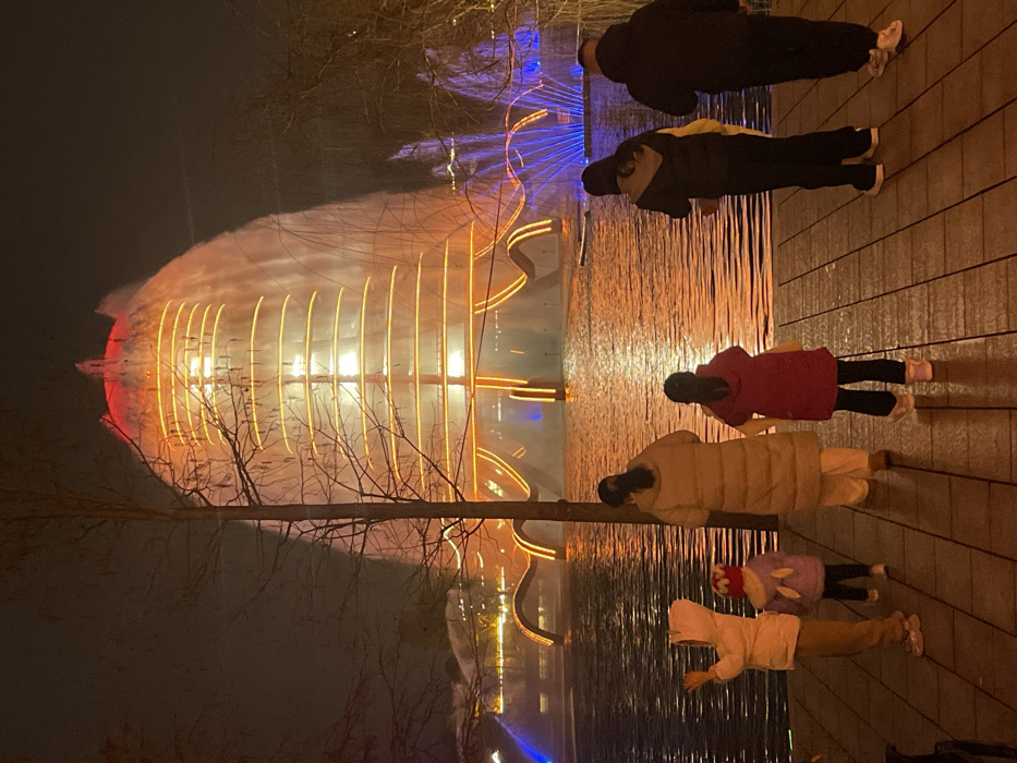 The image depicts a nighttime scene at the Bishan "Cloud" Fountain in Bishan, China