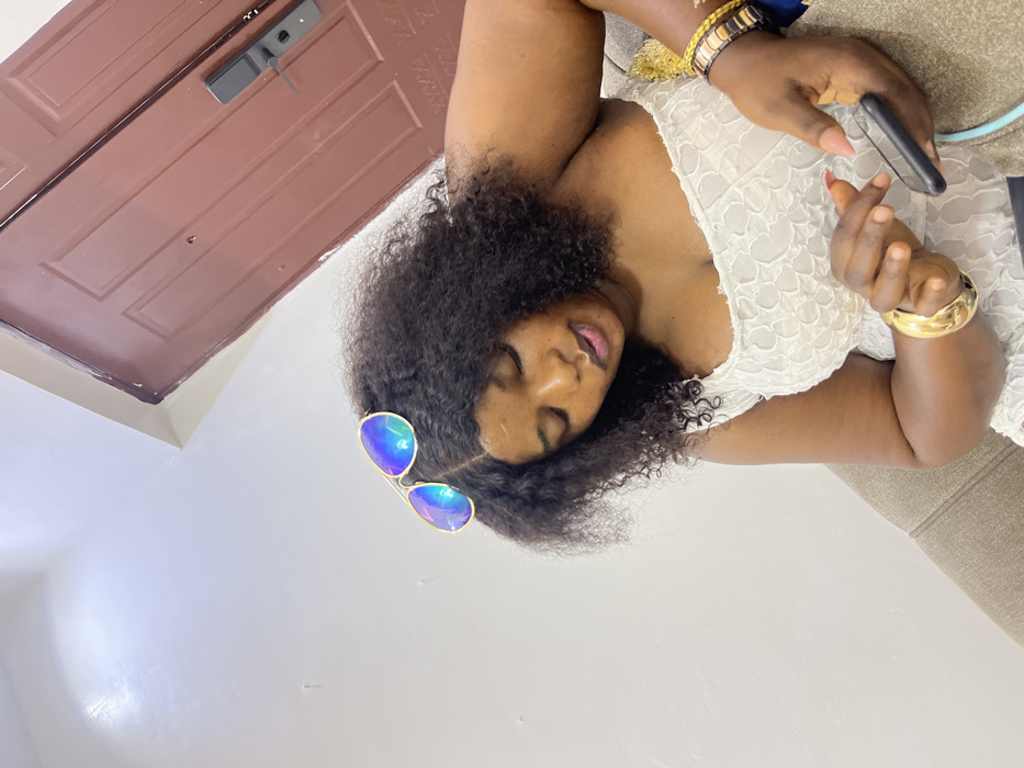 A female individual is depicted indoors, seated, and focused on a smartphone. The subject has dark, curly hair with a center part, and iridescent aviator-style sunglasses are perched on her head. She is wearing a white, textured top and has a gold-colored bangle on her left wrist, along with multiple bracelets on her right wrist. Her fingers, with pink-painted nails, are positioned on the screen of a dark-colored smartphone held in her left hand. Her gaze is directed downwards towards the device. The background consists of a plain white wall, and a reddish-brown paneled door with a black handle is visible in the upper right. The furniture she is seated on appears to be a light brown or grey cushioned sofa. The scene is located in Gwarinpa, Nigeria.