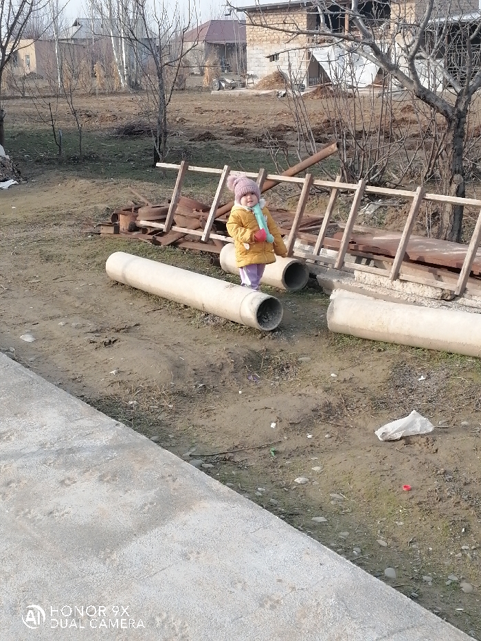 A toddler in a pink hat, yellow jacket, and light purple pants stands on a concrete pipe. A light blue scarf adorns the toddler's neck. Several concrete pipes and wooden frames surround the child. In the background, trees stand bare. Buildings, including a two-story stone structure and a house with a red roof, can be seen. The ground is dirt with sparse grass patches. A plastic bag lies on the ground in the lower right area.