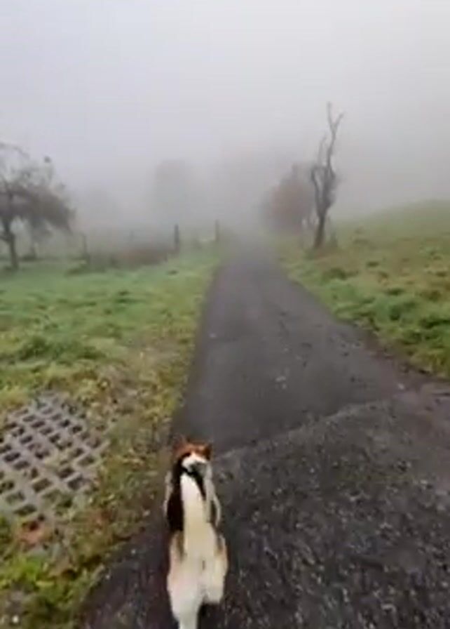 dog on a leash walking down a narrow asphalt path on a foggy day. The dog is small, with a long white tail, and is being walked away from the camera. The path leads straight ahead into the fog, and the landscape on either side is mostly green with some trees. The fog is thick, obscuring details of the background, and the overall mood is quiet and somewhat eerie.