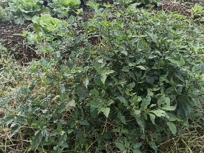 The image displays a ground-level perspective of a dense, leafy green bush dominating the foreground and midground. The bush, approximately 0.7 meters tall, features numerous small, ovate to lanceolate leaves, primarily dark green, with scattered lighter green patches and small perforations consistent with insect damage. Thin, branching stems are visible among the foliage. The immediate ground beneath and around the bush consists of dry, light-brown grass mixed with sparse green shoots. In the background, a cultivated area is evident. To the upper left, a large, light green leafy vegetable plant, resembling cabbage, grows in dark brown soil. To the upper right, an expanse of tilled brown earth with minimal vegetation is visible. No individuals, animals, or artificial structures are present. The scene depicts an outdoor agricultural or garden environment. The precise location within Ho Chi Minh City, Vietnam, is not discernible from the visual information, but the setting is consistent with a farming or cultivated zone on the city's outskirts.
