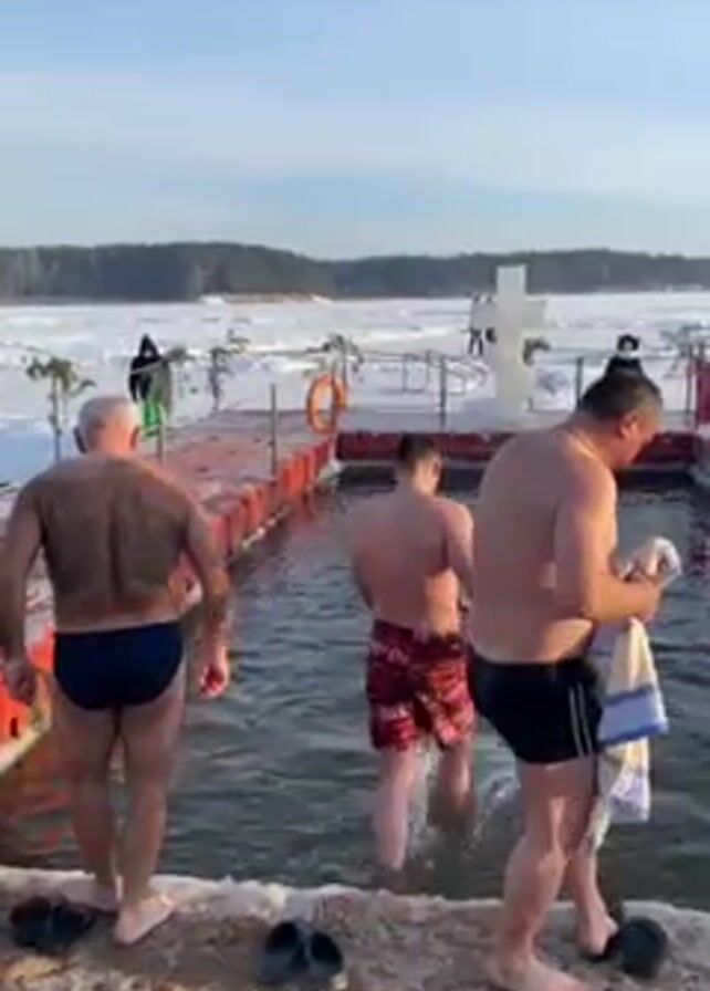 four men, wearing only swimming trunks, entering a man-made pool cut into a frozen lake or river. The water surrounding the pool is covered in ice and snow. A white cross made of ice stands on the platform above the water. Other people are visible standing on the ice in the distance, some of whom are wearing winter clothing. One of the men entering the pool is holding a towel.
